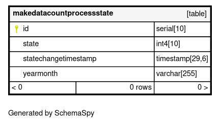 | id | serial | 10 | √ | nextval('makedatacountprocessstate_id_seq'::regclass) |
